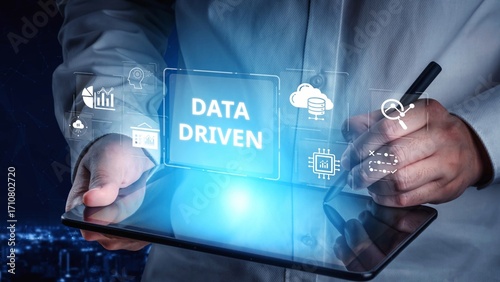 Fototapeta premium Data-driven decision-making empowers business through analytics, datum collection, and AI systems. Data driven tools support cloud data processing and data visualization across datum platforms. Muxer