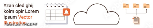 Fototapeta premium Data organization, cloud storage, scheduling, digital reminders, workflow management, file sharing. Calendar with bell icon, cloud and file hierarchy. Data organization and cloud storage concept