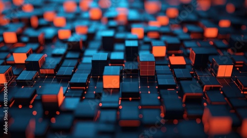 Obraz premium Data particles forming into structured 3D cubes on a dark tech background...