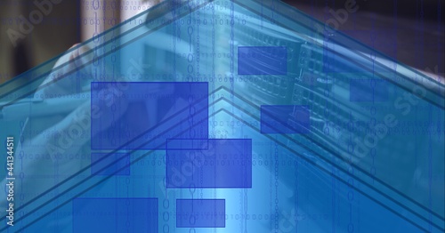 © vectorfusionart, Obraz premium Data processing on mid section of worker worker in server room against blue technology background