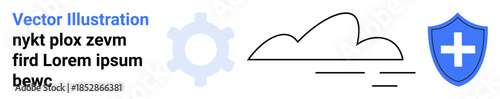 Obraz premium Data protection, cloud technology, cybersecurity, storage solutions, tech infrastructure, system integrity. A shield with a cross, a cloud and a gear icon. Cybersecurity and cloud technology