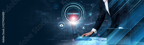 Fototapeta premium Data Science: Businessman uses laptop and synchronizes data of machine learning on a computer device with a global network, big data analytics, predictive modeling, artificial intelligence.