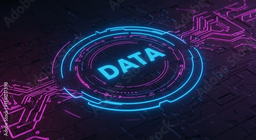 © GS-Studio, Obraz premium Data Visualization: Futuristic digital circuit board with a neon illuminated "DATA" icon, emphasizing technology and information.