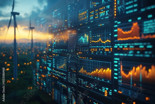 © Alienmarsh, Obraz premium Data visualization interface with graphs and wind turbines at sunset.