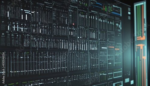 © Random_Mentalist, Obraz premium Data volume analysis and computer science background with numerical code flow, wall paper design