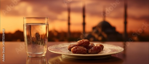 © Palugada, Fototapeta premium Dates and Water with Mosque Silhouette