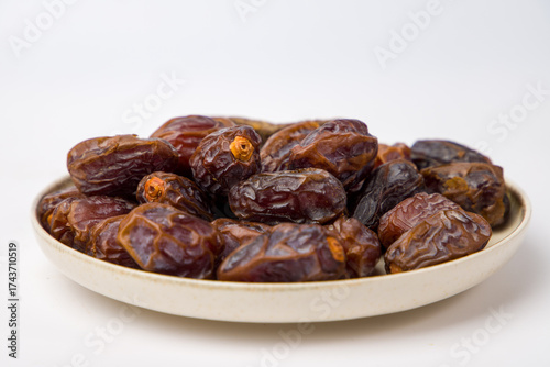 © Таня Микитюк, Obraz premium Dates fruit in a bowl on white background. Selective focus.