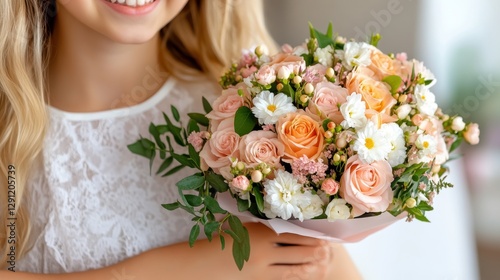 © AZ Studio, Naklejka premium Daughter joyfully presents a bouquet of flowers during a special family gathering at home in a bright and cheerful atmosphere