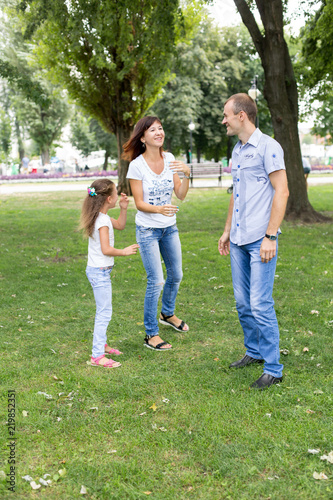 © Svetlana, Fototapeta premium daughter mom and dad sitting on the lawn. in a white t-shirt and jeans. a walk in the Park. child. mom dad daughter. summer. family.