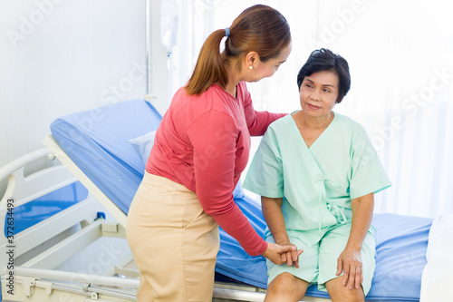 Obraz premium Daughter visiting her elderly mom in the hospital.
