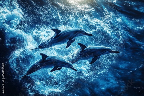 © Fathor, Fototapeta premium dauphins in blue ocean, drone fpv view.generative ai