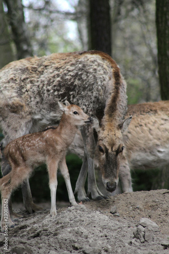 © Antje Lindert-Rottke, Fototapeta premium Davidshirsche, Kitz mit Muttertier