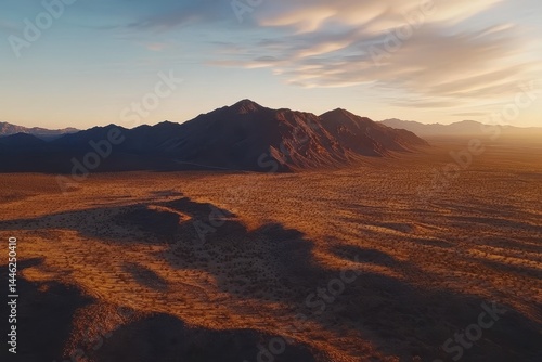 © Ifti Digital, Naklejka premium Dawn aerial view showcases remote desert mountains under soft sunlight in an expansive landscape, Dawn aerial shot of some remote desert mountains in California near the Nevada border