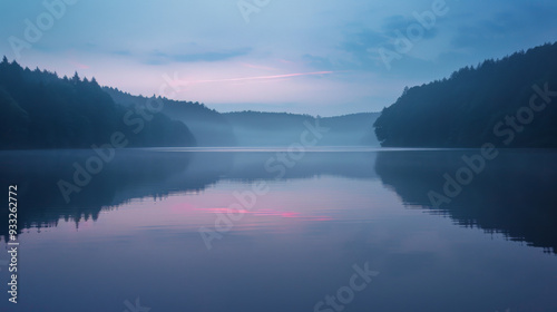 © Creative Valley, Fototapeta premium Dawn at lake with pink ribbon reflected on still water
