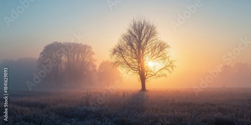 © vxnaghiyev, Naklejka premium Dawn in a Dutch village with hoarfrost on trees, highlighting seasonal change and cold weather conditions