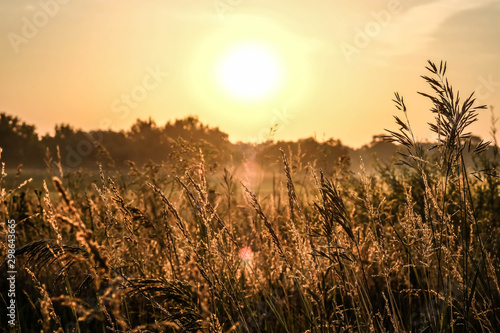 © Soyka, Fototapeta premium Dawn in a wheat field. Beautiful landscape on sunrise
