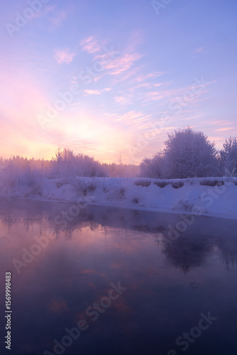 Fototapeta premium Dawn on a frosty morning on the river in winter