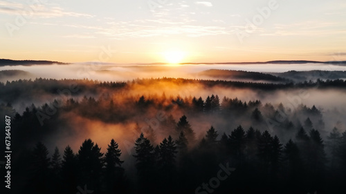 © serperm73, Obraz premium Dawn over the forest. View from a drone.
