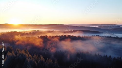 © serperm73, Obraz premium Dawn over the forest. View from a drone.