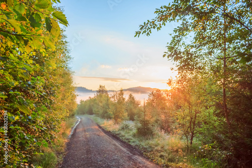 © helen13, Fototapeta premium Dawn. Road to the mountains