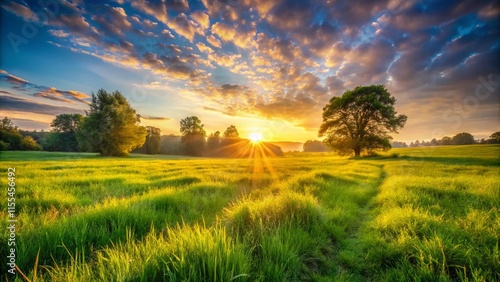 © Wanlop, Obraz premium Dawn's Embrace: Serene Wide-Angle Meadow Sunrise