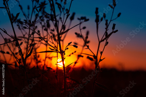 © dachux21, Obraz premium Dawn's Floral Symphony: Silhouetted Summer Flowers in Meadow's Embrace in Northern Europe