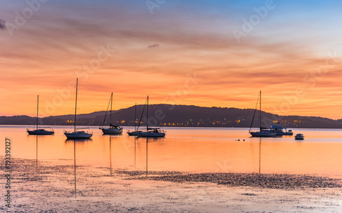 © Merrillie, Fototapeta premium Dawn Waterscape over the Bay with Boats