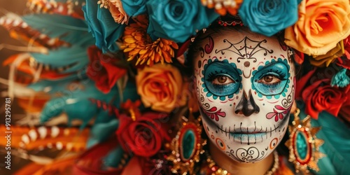 Fototapeta premium Day of the Dead sugar skull makeup with colorful flowers on brown background.