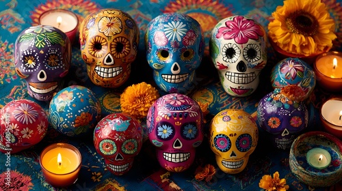 Fototapeta premium Day of the dead sugar skulls colorful mexican tradition dia de muertos celebration candles and flowers art