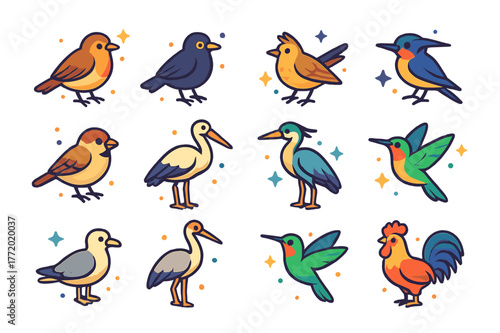 © Svitlana, Naklejka premium Daybreak Bird Icons. birds at daybreak. Colorful isometric vector icons set of birds at daybreak: robin, blackbird, skylark, swallow, sparrow, stork, heron,