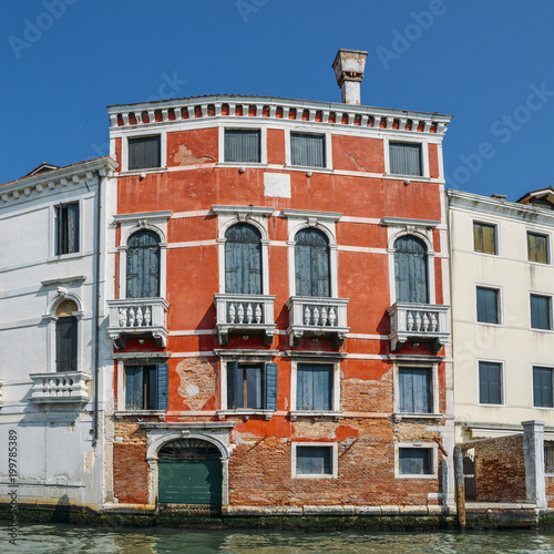 © Alexandre Rotenberg, Naklejka premium Daylight view to red historic building on a Venetian canal.