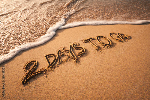Fototapeta premium “2 Days to Go” Handwritten in Warm Beach Sand with an Incoming Wave and...