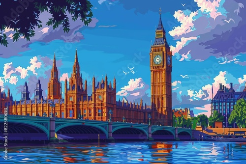 Naklejka premium Daytime vector illustration of Big Ben and the Houses of Parliament under...