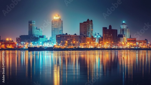 Naklejka premium Dazzling Cityscape Reflected on Glimmering River at Twilight