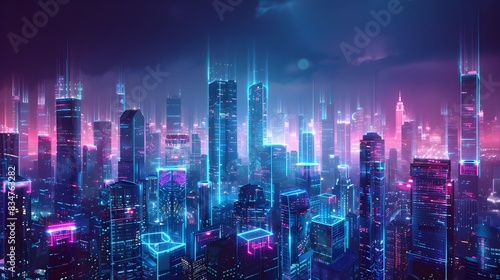 Obraz premium Dazzling Cityscape with Neon Lit Holographic Landmarks and Interactive Data...