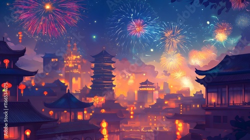 © sctung, Fototapeta premium Dazzling Fireworks Display Over Illuminated Asian Cityscape - Vibrant Celebration, Festive Skyline, Nighttime Spectacle