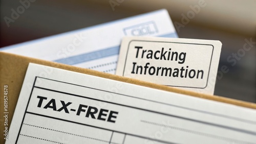 © supaporn, Naklejka premium De Minimis Value Documents labeled "Tax-Free" and "Tracking Information" in a folder, indicating financial or tax-related content.