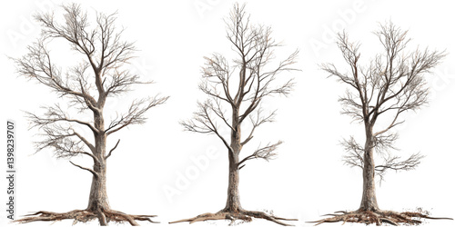 © aura studio, Obraz premium Dead pine trees vector, wood shapes, dry forest elements, pine silhouettes, tree trunks, bare branches, nature clipart, isolated pine outlines, abstract timber graphics