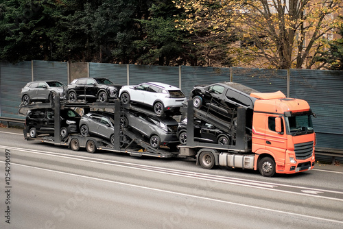 Obraz premium Dealership Car Carrier Truck Transporting Brand-New vehicles for Logistics Distribution