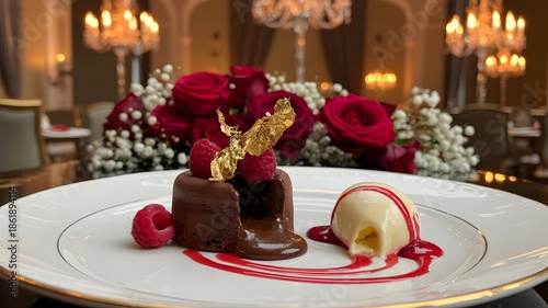 Naklejka premium Decadent chocolate lava cake with raspberries and ice cream in a luxurious setting
