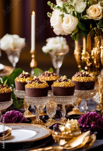 © Yaraslava, Naklejka premium decadent chocolate mousse cups elegant dessert table, sweet, creamy, indulgent, delicious, gourmet, fancy, luxury, presentation, bar, exquisite, rich, treat