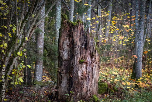 © Sandris Veveris, Obraz premium Decayed Tree Stump in Autumn Forest