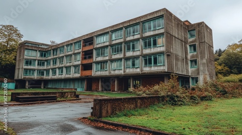 © Fikri, Obraz premium Decaying Brutalist Architecture: Abandoned Building with Concrete Facade and Overgrown Landscape