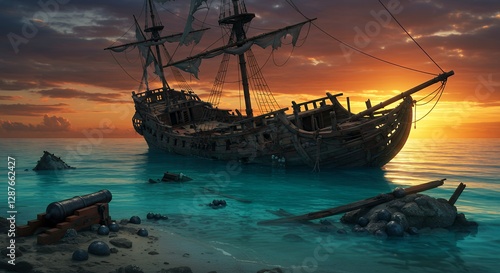 © ryandi, Naklejka premium Decaying pirate ship rests near a tranquil tropical island shore