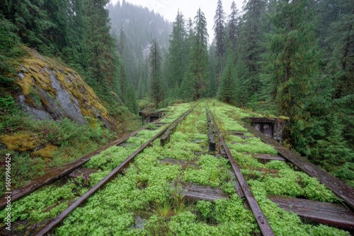 Fototapeta premium Decaying railway tracks overgrown with lush greenery, shrouded in misty forest