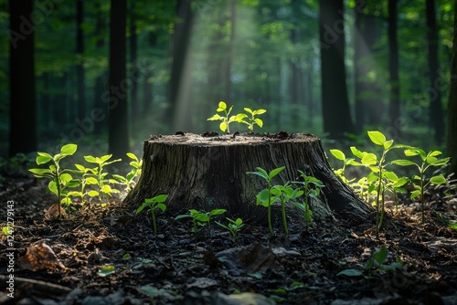 Fototapeta premium Decaying tree stump nurtures new life under soft sunlight in a forest setting