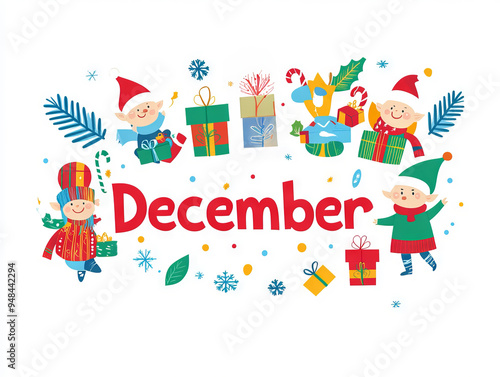 © karenfoleyphoto, Fototapeta premium December illustrated with colorful seasonal icons