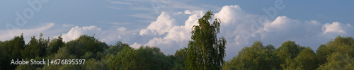 Obraz premium Deciduous forest against the background of a blue cloudy sky during the day, panorama.