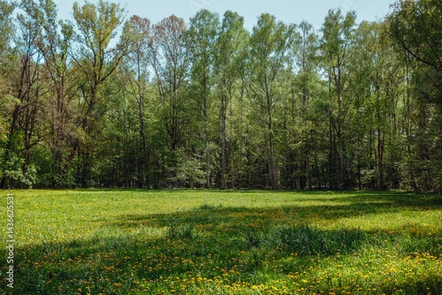© littlepearlstock, Obraz premium Deciduous Forest and Dandelion Meadow