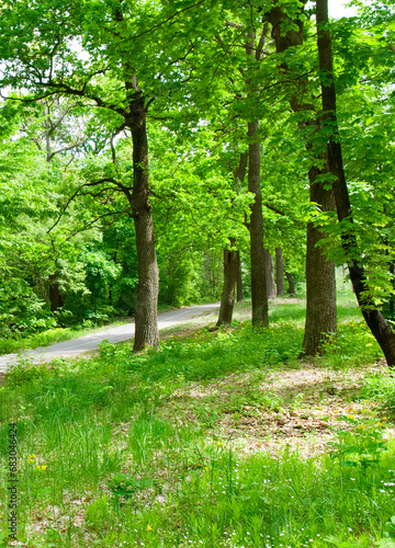 Fototapeta premium Deciduous forest, green grass and pathway. Vertical photo.